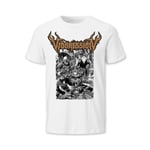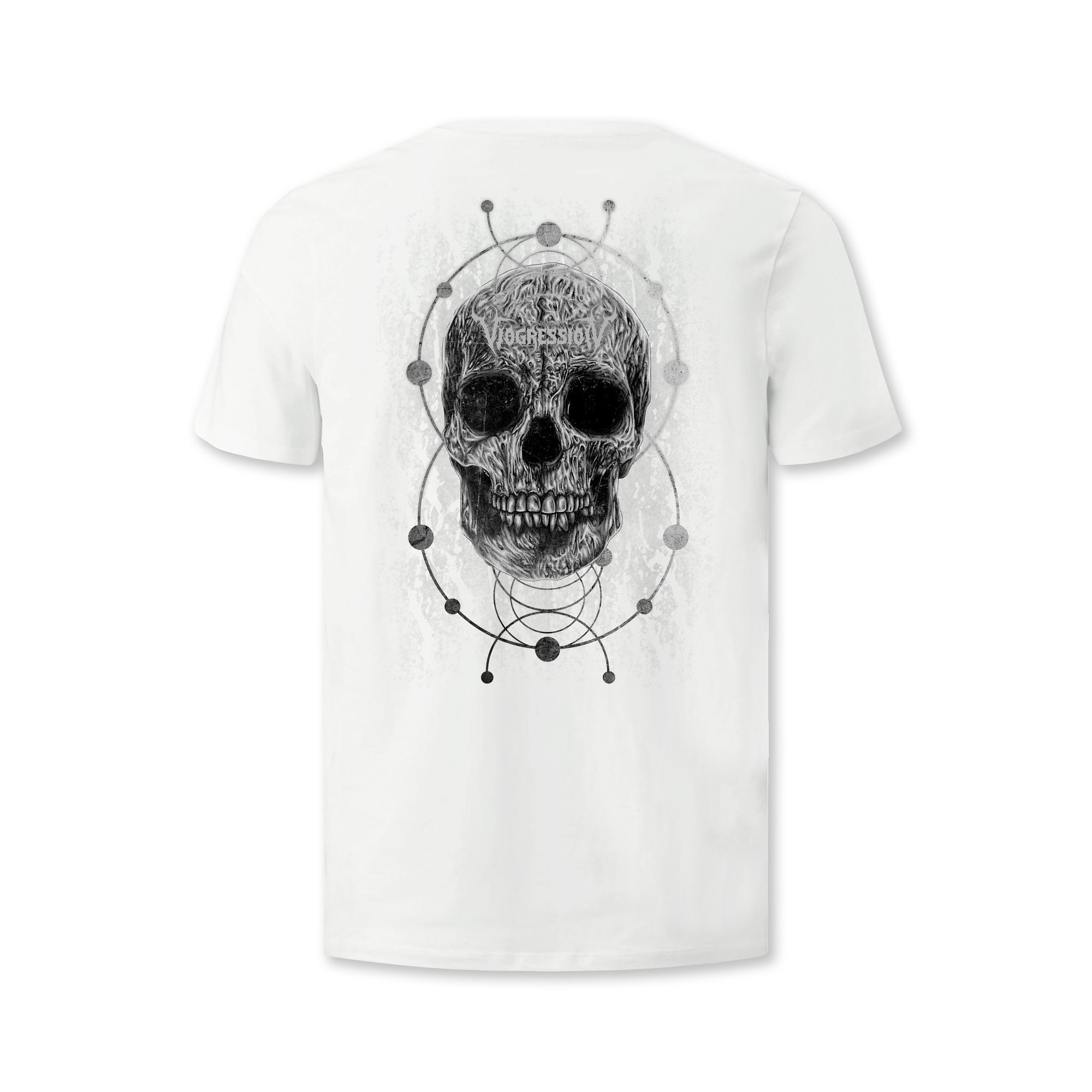 Viogression Demons T-Shirt: Constructed from high-quality soft cotton, this black short-sleeve T-Shirt showcases a detailed monochromatic graphic on the front. The back features a skull design accented with celestial patterns.